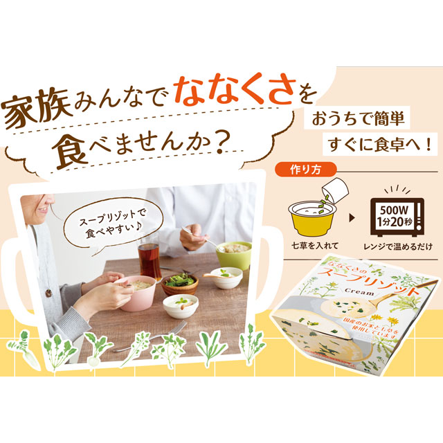ちょっとしたギフトにもおすすめ。1つで一人分のスープリゾット七草が電子レンジですぐできます。