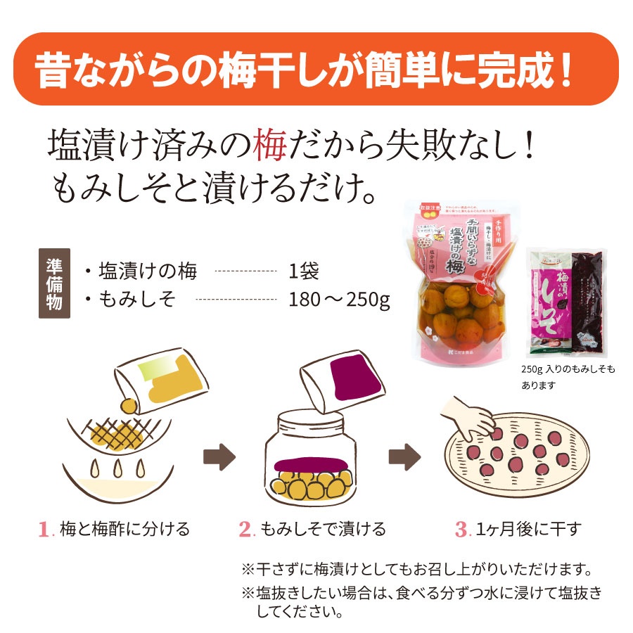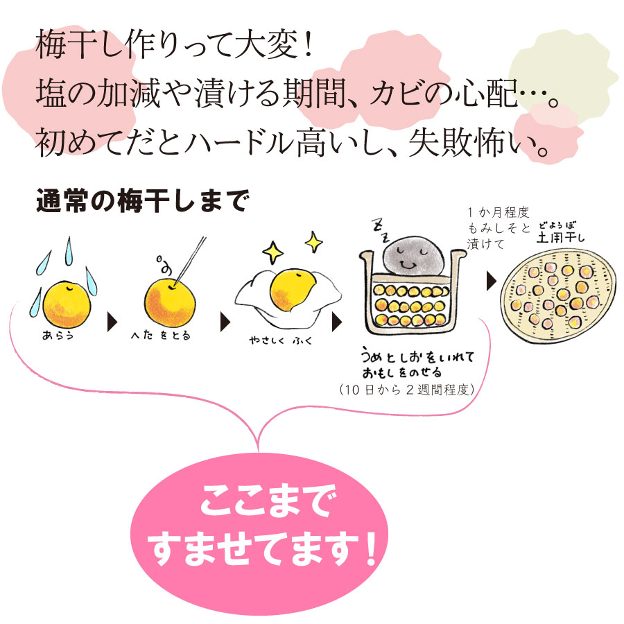 梅を塩漬けをして梅酢が上がるのを待つ工程が不要。