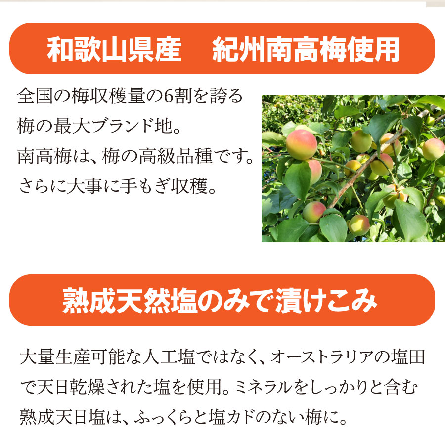 塩分約20%の梅漬けです。はちみつ梅等の調味梅を作る際は、24時間程度水に浸けて塩抜きをしてお使いください。その場合冷蔵保存してください。使う分ずつ塩抜きしてお使いいただくことをおすすめします。