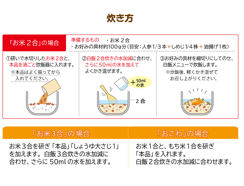 その他:3合での炊き方、おこわの炊き方 は袋に記載